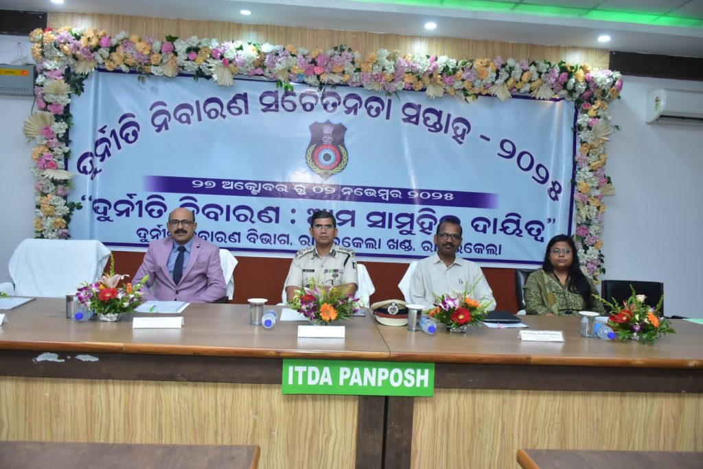 ଦୁର୍ନୀତି ନିବାରଣ ସପ୍ତାହ ପାଳନ ଅବସରରେ ଆଜି ଜିଲ୍ଲା ପ୍ରଶାସନ ଓ ଦୁର୍ନୀତି ନିବାରଣ ବିଭାଗ ରାଉରକେଲା ମିଳିତ ସହଯୋଗରେ ସ୍ଥାନୀୟ ଆଇଟିଡିଏ ସମ୍ମିଳନୀ କକ୍ଷରେ ଏକ କାର୍ଯ୍ୟକ୍ରମ ଆୟୋଜିତ ହୋଇଯାଇଛି। ଚଳିତ ଵର୍ଷ ଅକ୍ଟୋବର ୨୭ ରୁ ନଭେମ୍ବର ୨ ତାରିଖ ପର୍ଯ୍ୟନ୍ତ ଦୁର୍ନୀତି ନିବାରଣ ସପ୍ତାହ ପାଳନ କରାଯାଉଛି lଚଳିତ ବର୍ଷ ଏହି ଦୁର୍ନୀତି ନିବାରଣ ସପ୍ତାହ ପାଳନର ଶୀର୍ଷକ ହେଉଛି ” ଦୁର୍ନିତି ନିବାରଣ : ଆମ ସାମୁହିକ ଦାୟିତ୍ବ” lଆଜିର କାର୍ଯ୍ୟକ୍ରମରେ ପଶ୍ଚିମାଂଚଳ ଆରକ୍ଷୀ ଉପମହାନୀରିକ୍ଷକ ଶ୍ରୀ ବ୍ରିଜେଶ ରାଏ ମୁଖ୍ୟ ଅତିଥି ଭାବରେ ଯୋଗଦାନ କରିଥିଲେ l ଏହି ଅବସରରେ ସେ କହିଥିଲେ ଯେ ସମସ୍ତଙ୍କ ମିଳିତ ସହଯୋଗରେ ଦୁର୍ନୀତି ମୁକ୍ତ ସମାଜ ଗଠନ କରା ଯାଇପାରିବ l ଯୁବ ପିଢି ମାନେ ଏହା ପାଇଁ ଆଗେଇ ଆସନ୍ତୁ l ଦୁର୍ନୀତି ନିବାରଣ କଲେ ହିଁ ସମାଜର ତଥା ଦେଶର ପ୍ରଗତି ସୁନିଶ୍ଚିତ ହେବ l